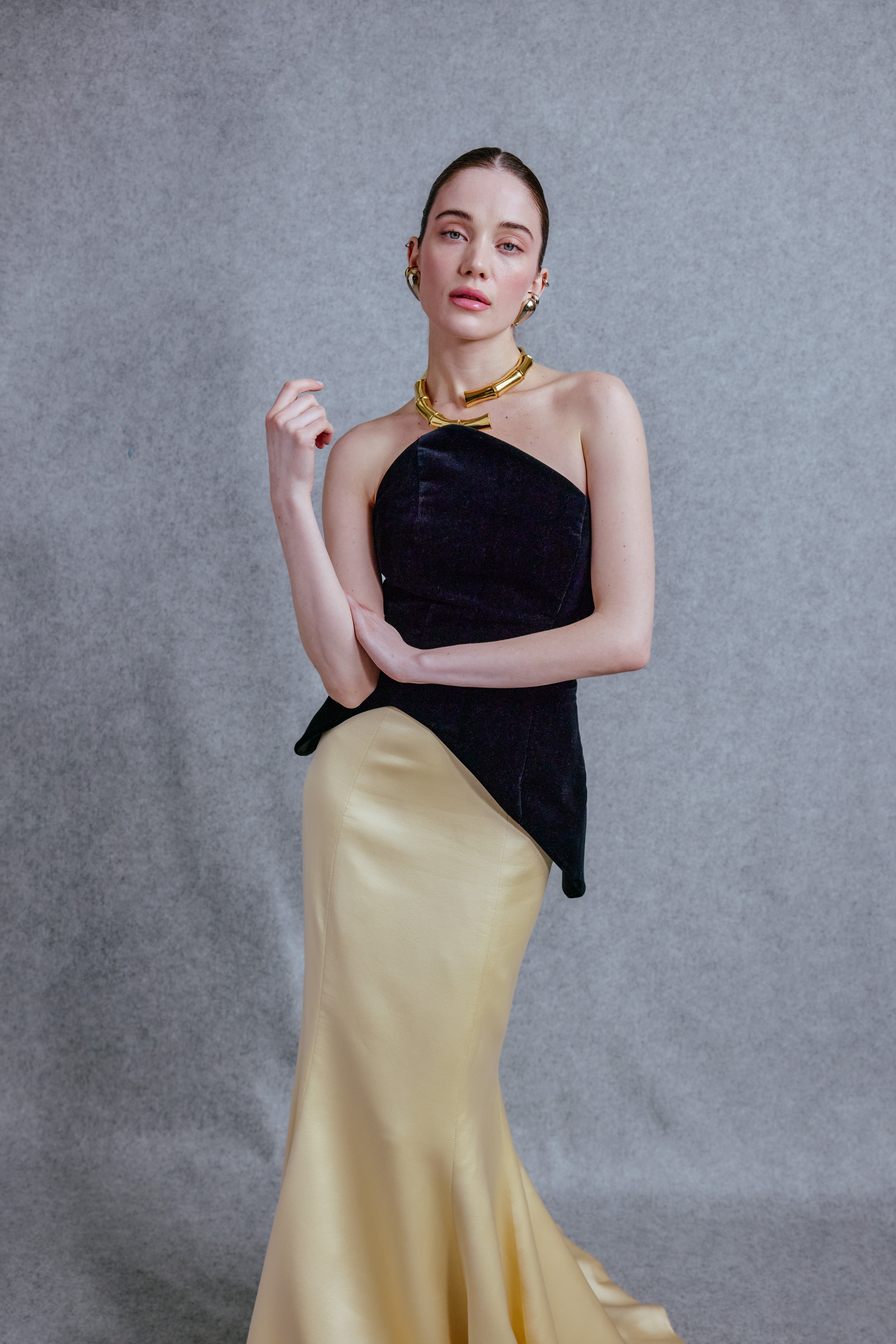 ASYMMETRICAL BLACK VELVET BODICE WITH A STRUCTURED, SCULPTURAL SILHOUETTE THAT DRAPES OVER THE WAIST