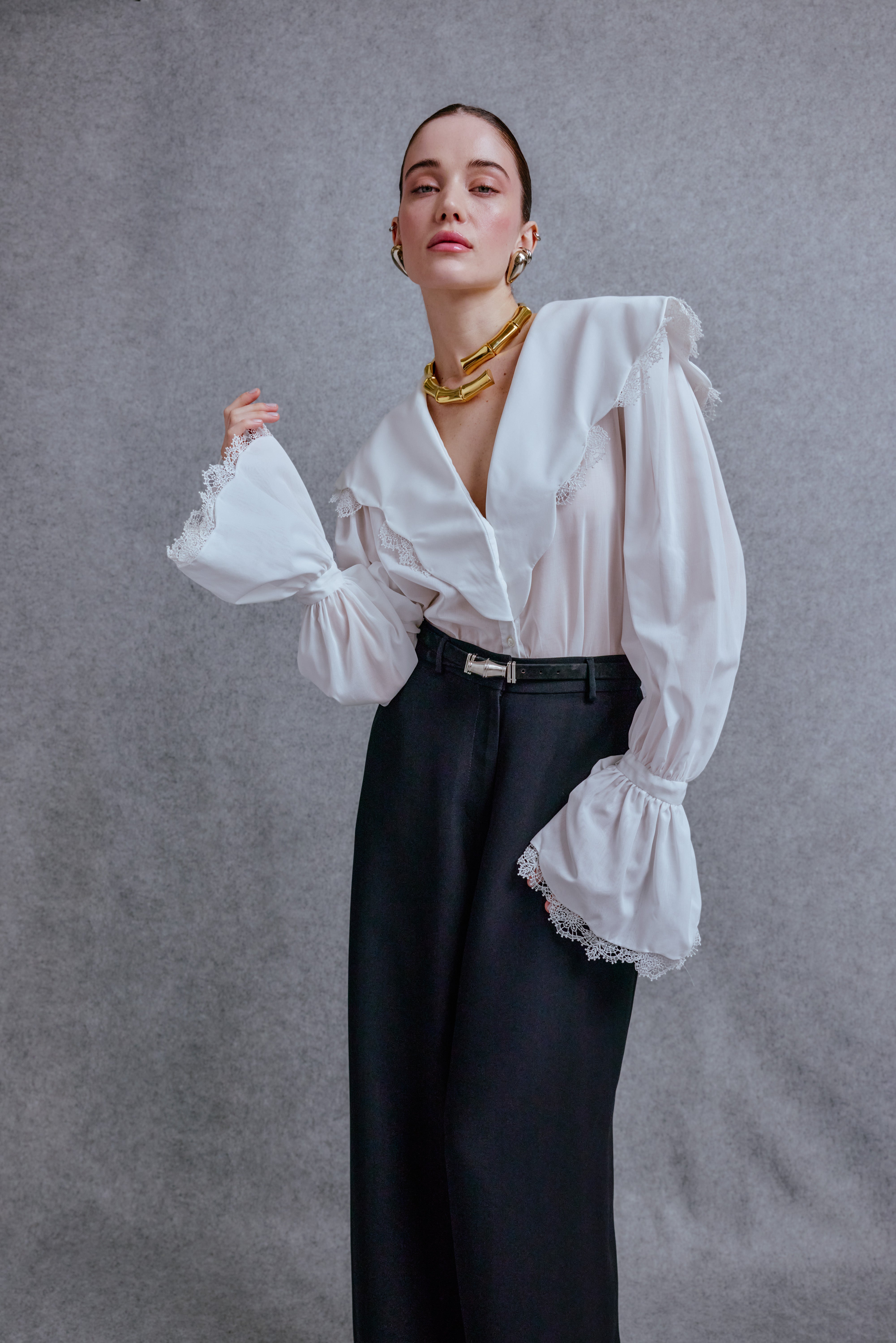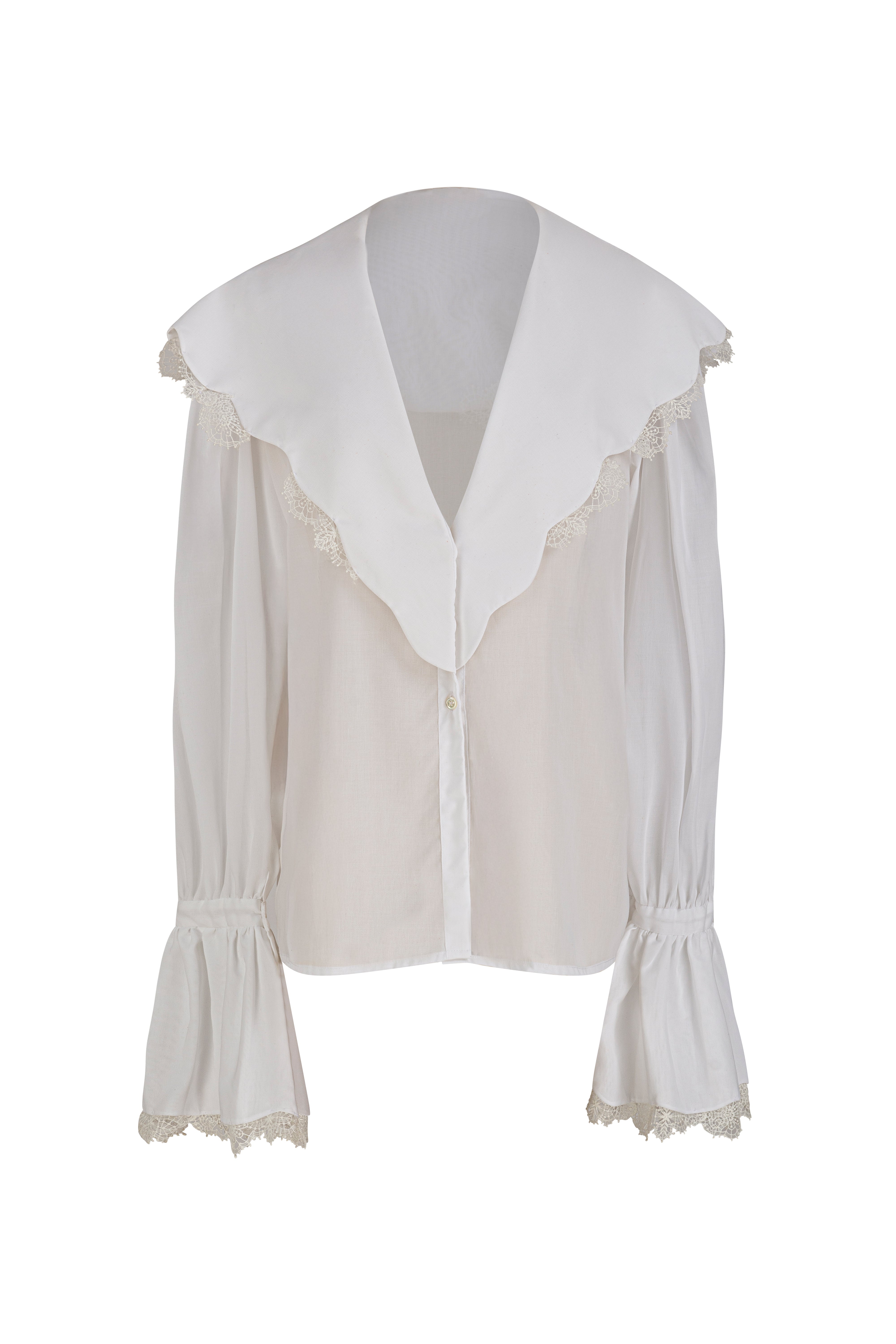 COTTON VOILE CLOUD SHIRT WITH LARGE COLLAR AND FLOUNCE SLEEVE FINISHED OFF WITH A LACE DETAIL