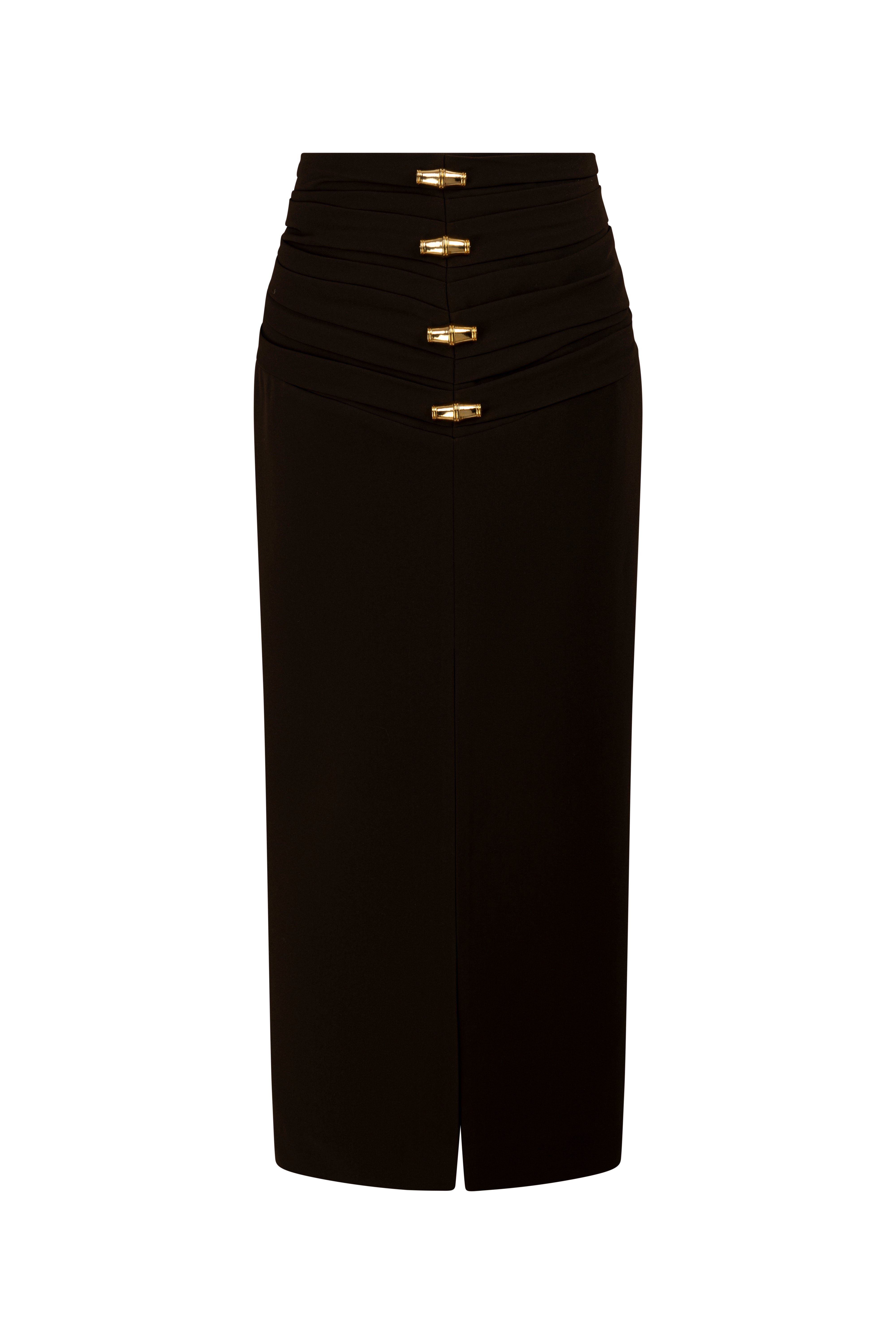 MIDI CREPE SKIRT WITH HAND DRAPED HIP DETAIL FINISHED WITH BAMBOO JEWEL BUTTONS