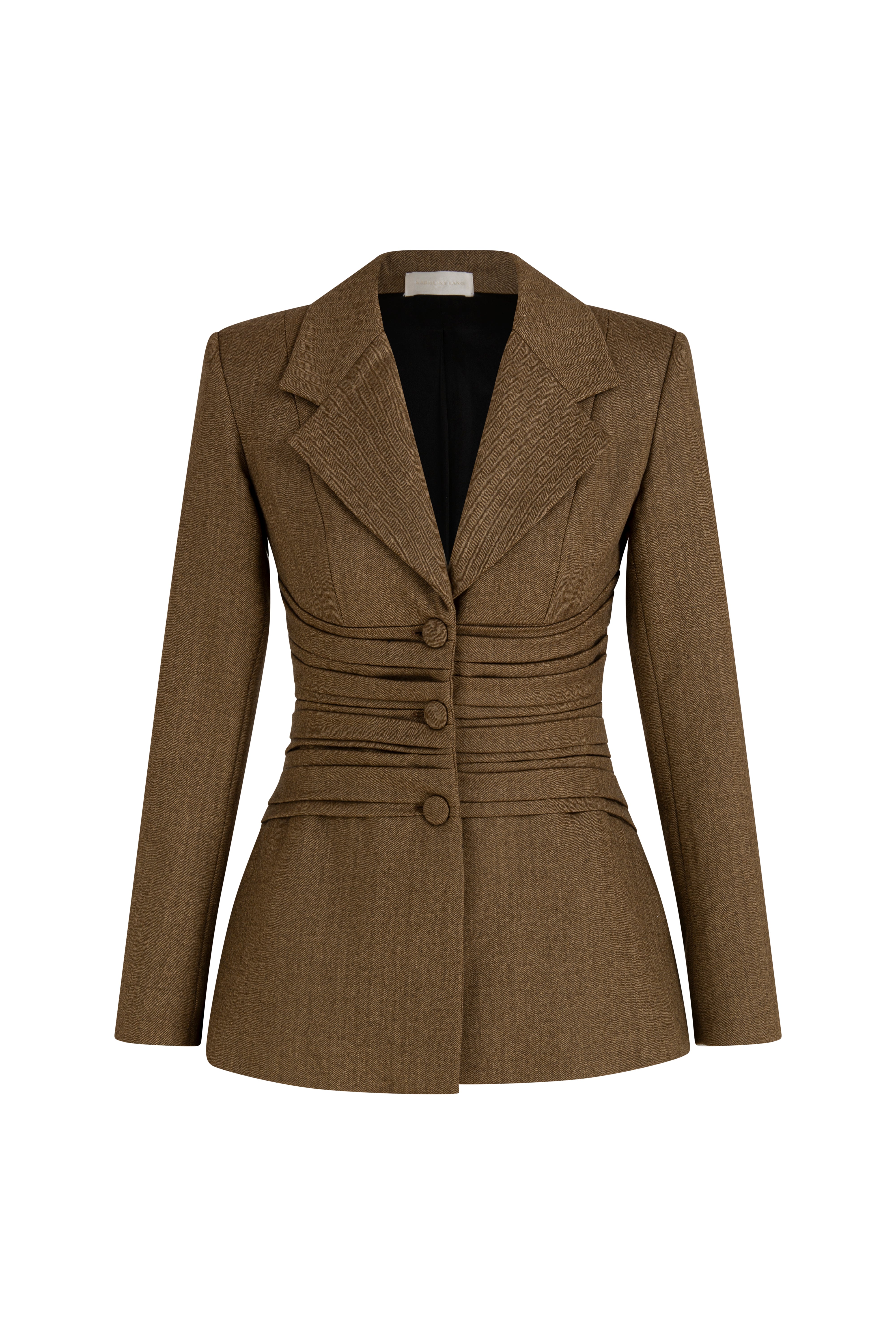 WOOL CHEVRON TAILORED BLAZER WITH HAND GATHERED WAIST PLEATED DETAIL