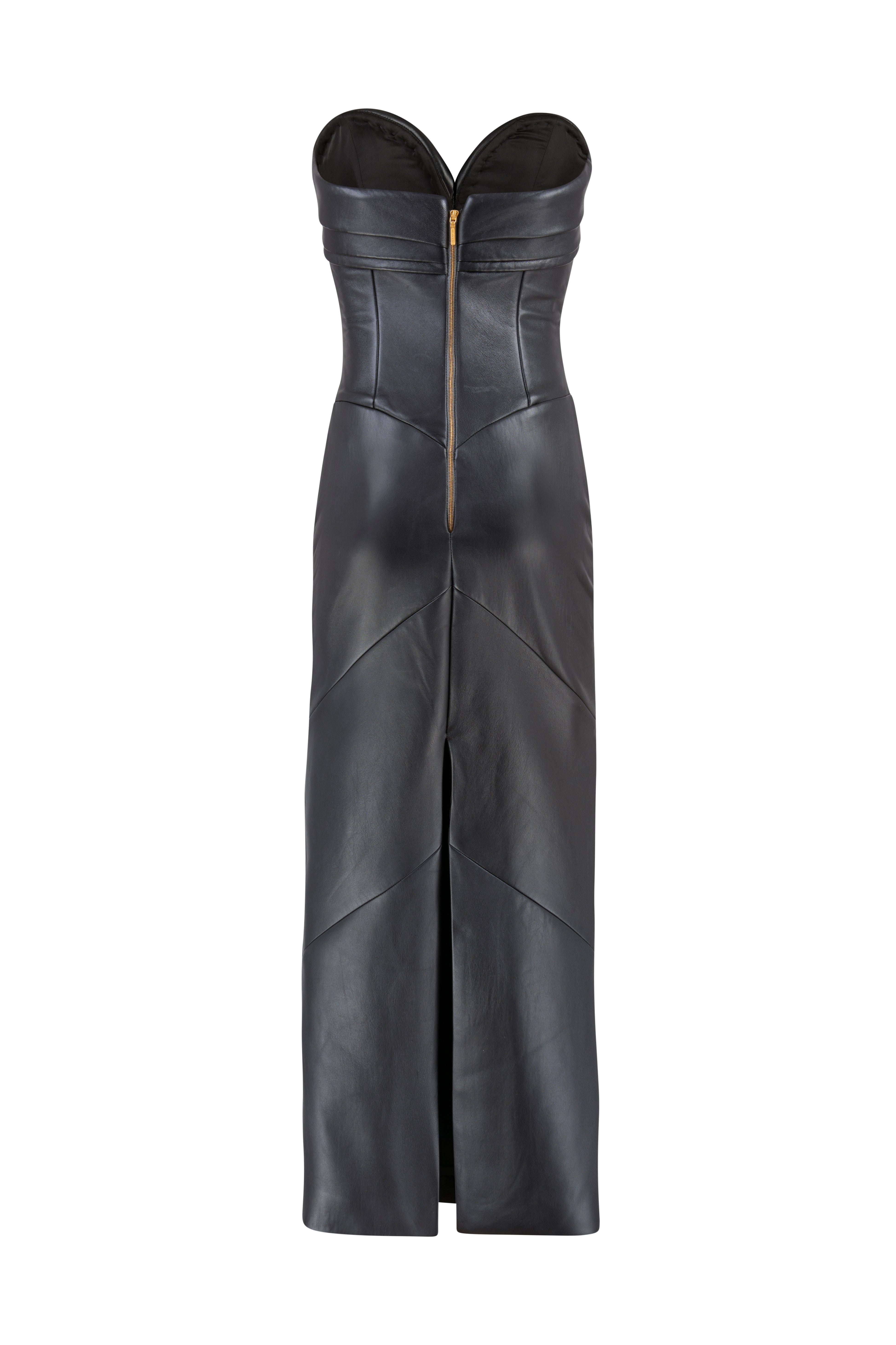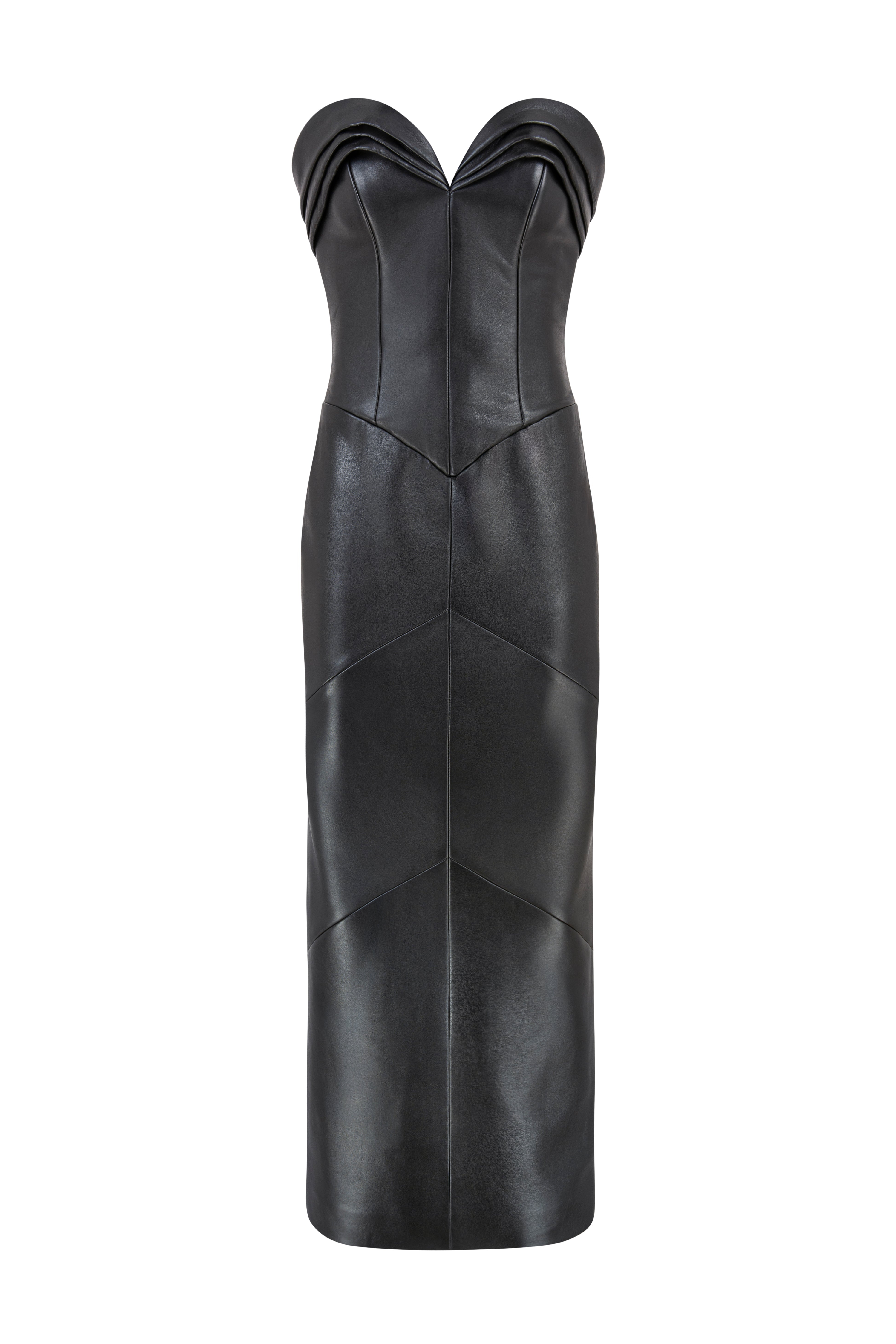 LEATHER MIDI DRESS WITH ELABORATE BUST DETAIL.
